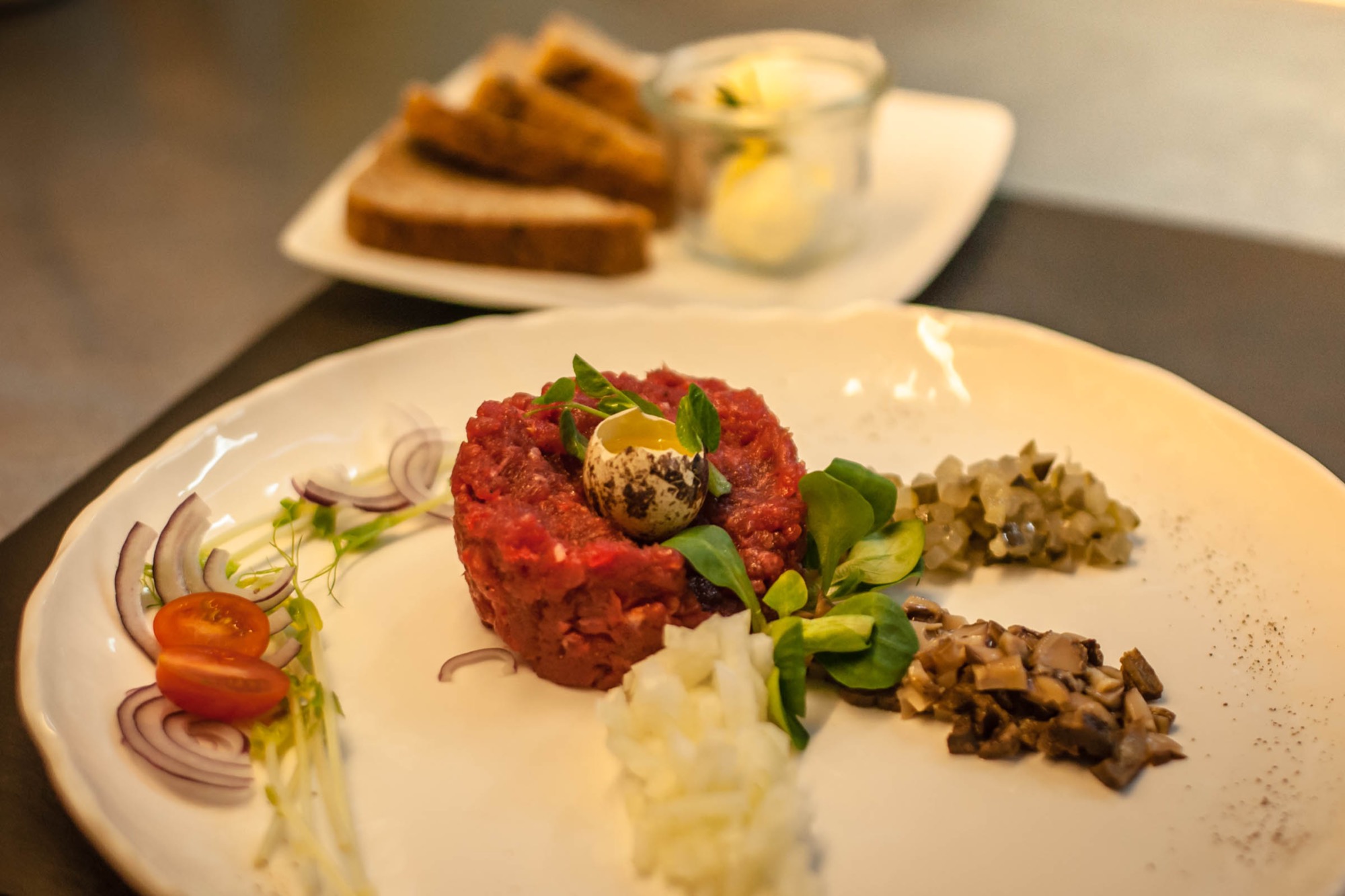Tatar wołowy/ogórek/pieczarki/cebulka